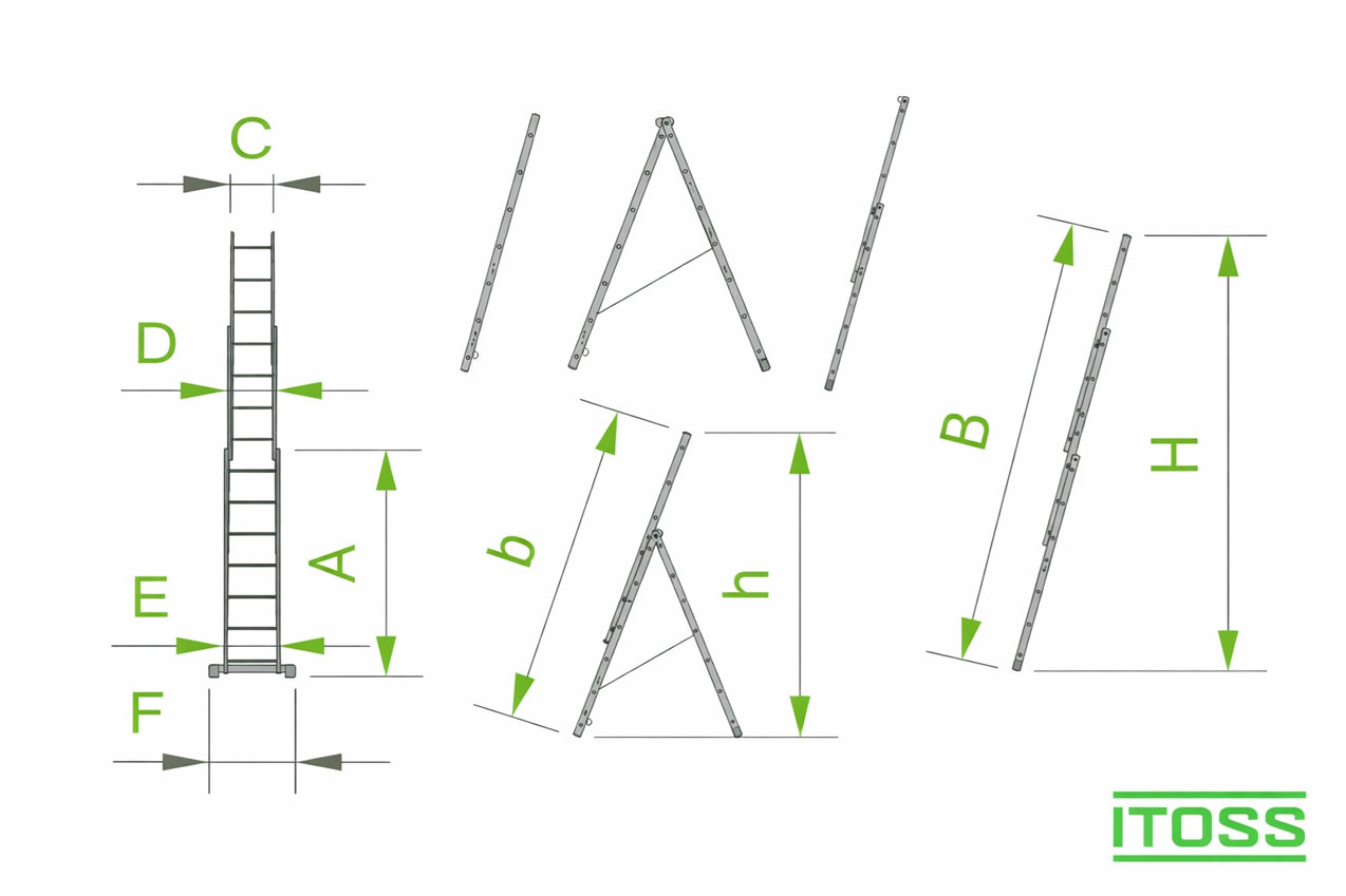 Aliuminės trijų dalių universalios kopėčios, pritaikytos darbui ant laiptų, nelygių paviršių ir įvairiose darbo situacijose. Konstrukcija leidžia naudoti kopėčias kaip pristatomas, ištraukiamas arba laisvai stovinčias, užtikrinant stabilumą ir saugų darbą.