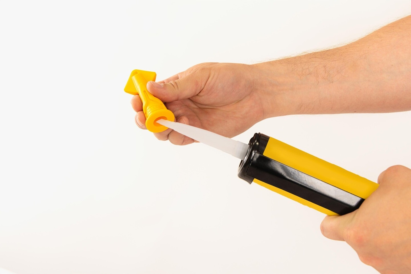 - Spaudžiant hermetiką, antgalį prilaikyti ir slysti palei siūlę, kad susiformuotų tvarkingas užpildymas