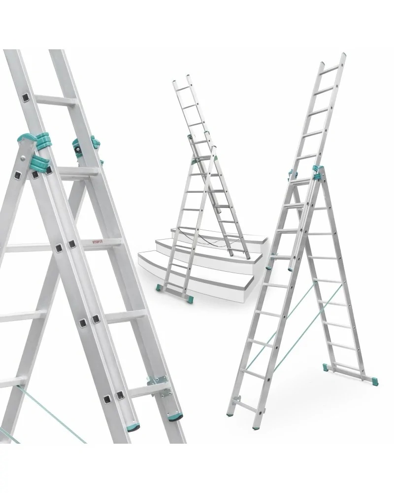 Trijų dalių universalios kopėčios iš aliuminio, pritaikytos naudoti tiek buityje, tiek profesionalioje aplinkoje.