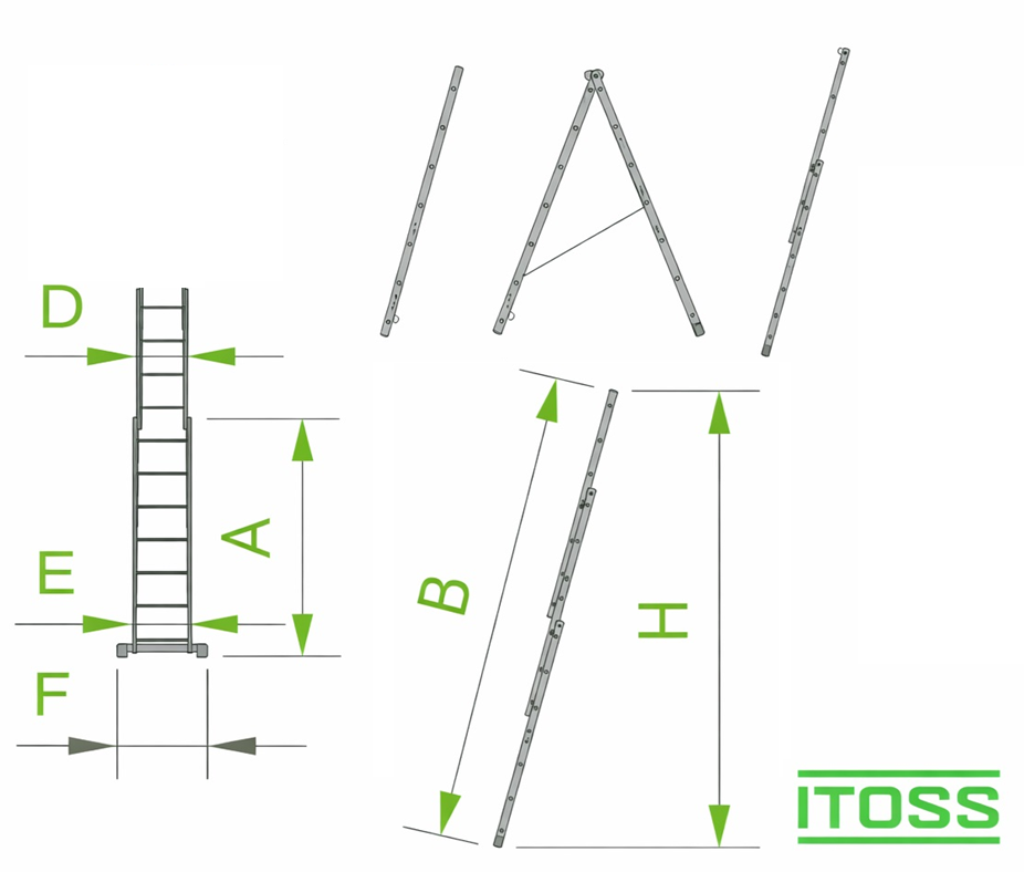 | Kodas | Pakopos | A (m) | B (m) | D (mm) | E (mm) | Stabilizatorius F (mm) | H (m) | Svoris (kg) | Profilis (mm) | Transportavimo matmenys (cm) |