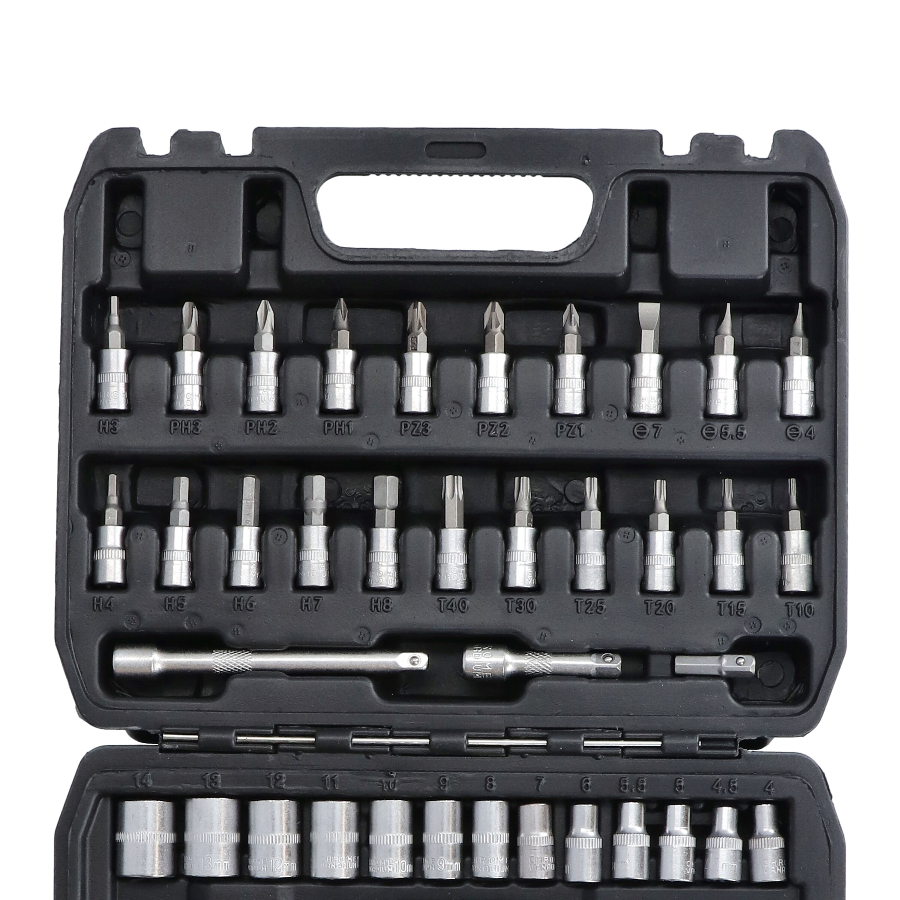 Kompaktiškas 53 dalių 1/4″ galvučių rinkinys iš chromvanadžio plieno (CR-V), skirtas...