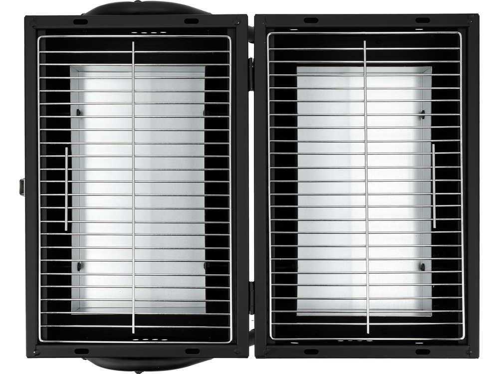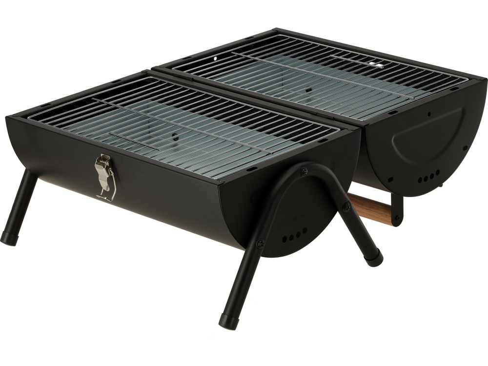 Kompaktiškas anglinis nešiojamas grilis su dangčiu, skirtas kepimui sode, terasoje ar išvykose. Dvi atskiros chromuotos grotelės leidžia naudoti vieną arba abi kepimo zonas pagal poreikį. Visiškai atlenkus dangtį, abu grotelių paviršiai gali būti naudojami vienu metu, todėl grilį lengva pritaikyti tiek greitam kepimui, tiek didesniam maisto kiekiui ruošti.